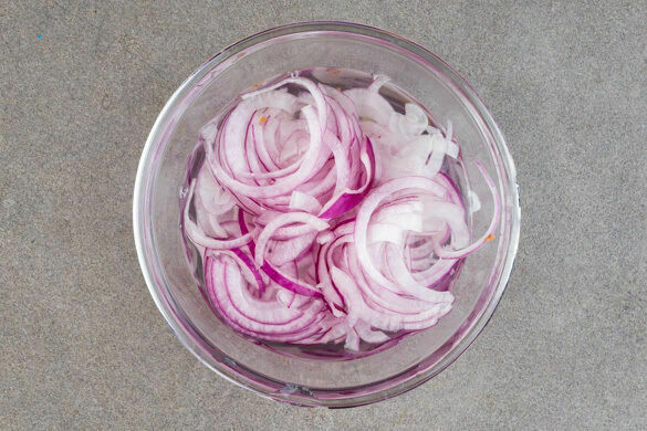 1½TL Zucker, ½–1TL Salz, 70ml hellen Essig und 70ml warmes Wasser verrühren, bis sich Salz und Zucker aufgelöst haben, dann die Zwiebeln untermengen und beiseitestellen.