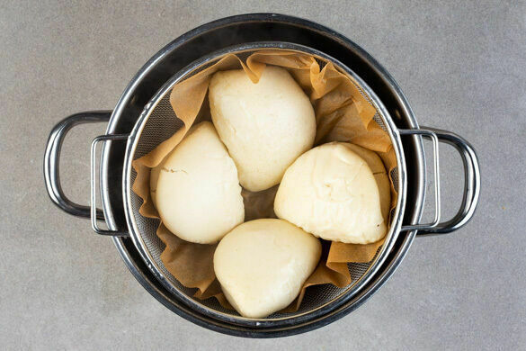 Einen großen Topf bis unter den Dämpfeinsatz mit Wasser füllen und das Wasser zum Kochen bringen. Tipp: Statt dem Dämpfeinsatz kann auch ein passendes Sieb verwendet werden. Den Dampfbehälter mit Backpapier auslegen, die Hefebrötchen hineingeben und ca. 7Min. abgedeckt dämpfen, bis sie weich und fluffig sind. Vorsicht, heißer Dampf!