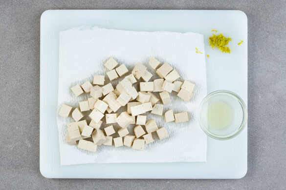 Den Tofu in ca. 1cm große Würfel schneiden und auf etwas Küchenkrepp verteilen. Mit einer zweiten Lage Küchenkrepp abdecken und eine schwere Pfanne darauf platzieren, damit der Tofu etwas Flüssigkeit verliert. Die Limettenschale abreiben, dann die Limette halbieren und auspressen.