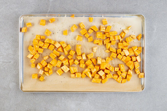 Die Süßkartoffeln schälen und in ca. 1cm große Würfel schneiden. Auf einem mit Backpapier ausgelegten Backblech mit 2EL Olivenöl sowie je 2 Prisen Salz und Pfeffer vermengen, gleichmäßig verteilen und ca. 15Min. im Ofen rösten.