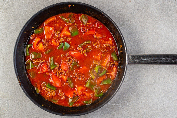 In einer mittelgroßen Pfanne 1EL Olivenöl bei mittlerer bis starker Hitze erwärmen. Das Hackfleisch, ¾ der Zwiebeln, die Paprika, die Gewürzmischung und 1 kräftige Prise Salz und Pfeffer in die Pfanne geben und 3–4Min. braten, bis das Hackfleisch zu bräunen beginnt.