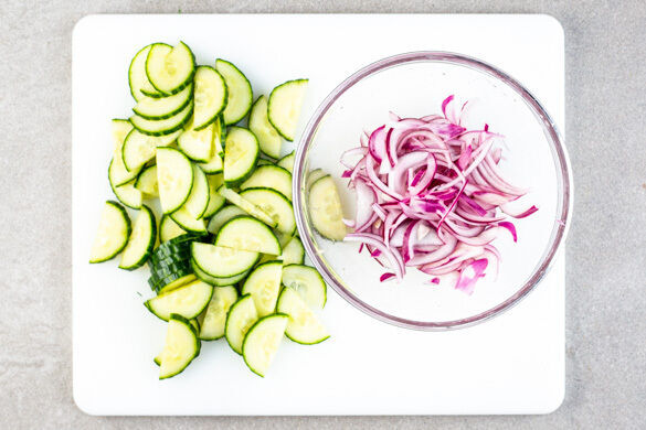 Die Zwiebel schälen, halbieren und in feine Streifen schneiden, dann mit 1EL Essig, 1TL Zucker und ½TL Salz vermengen. Die Gurke längs halbieren und quer in dünne Scheiben schneiden.