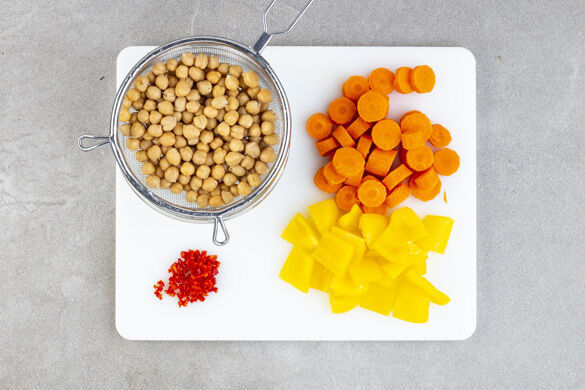 Die Kichererbsen in einem Sieb mit kaltem Wasser abspülen und abtropfen lassen. Die Karotten ggf. schälen und in Scheiben schneiden. Die Paprika halbieren, entkernen und in Würfel schneiden. Die Peperoni längs halbieren, für weniger Schärfe ggf. entkernen und je nach Geschmack die ½ der Peperoni oder mehr fein würfeln.