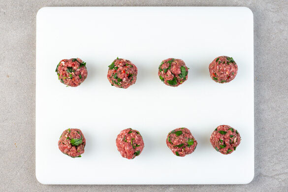 Das Hackfleisch mit der ½ der Chimichurri-Mischung und je 1 Prise Salz und Pfeffer vermengen und zu ca. 8 walnussgroßen Bällchen formen.
