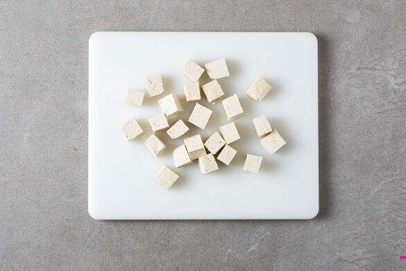 Den Tofu trocken tupfen und in ca. 2cm große Würfel schneiden.