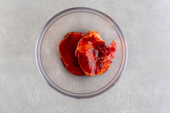 Die ½ der Chilipaste, die Sojasauce und ½TL Pfeffer zu einer Würzsauce verrühren. Das Fleisch trocken tupfen, mit der Würzsauce vermengen und beiseitestellen.