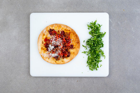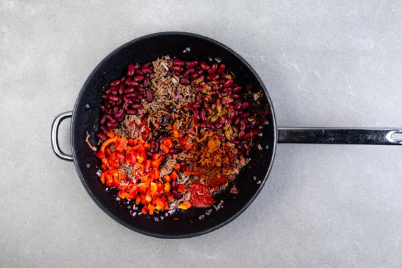 Das Hackfleisch mit den Zwiebeln in einer mittelgroßen Pfanne mit 1EL Olivenöl bei starker Hitze 3–4Min. scharf anbraten. Das Tomatenmark, die Bohnen und die Paprika unterrühren und mit 250ml Wasser ablöschen.