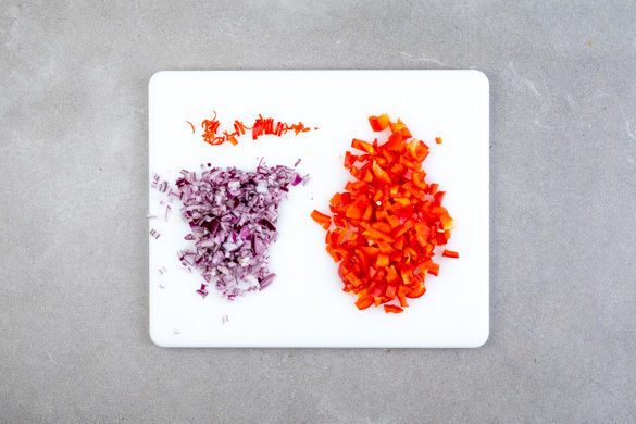 Den Backofen auf 200°C (180°C Umluft) vorheizen. Die Paprika vierteln, entkernen und in kleine Würfel schneiden. Die Zwiebel schälen, halbieren und fein würfeln. Die Chilischote längs halbieren, entkernen und in hauchdünne Streifen schneiden. Tipp: Wer es nicht scharf mag, lässt die Chilischote einfach weg.