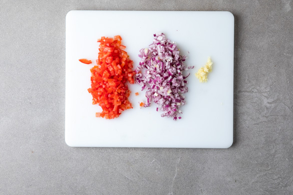 Die Tomaten vierteln, entkernen und in kleine Würfel schneiden. Die Zwiebel schälen, halbieren und ebenfalls in kleine Würfel schneiden. Den Knoblauch schälen und fein würfeln.