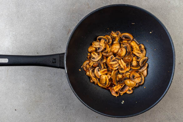 1TL Pflanzenöl in den Wok oder die Pfanne geben und den Knoblauch, 1EL Sojasauce und die Sriracha-Sauce bei mittlerer bis starker Hitze einige Sekunden erwärmen. Dann die Pilze dazugeben und 4–5Min. braten. Die Pilze aus der Pfanne nehmen, sobald sie appetitlich gebräunt und weich sind.
