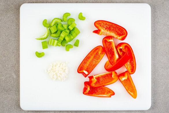 Den Backofen auf 220°C (200°C Umluft) vorheizen. Den Knoblauch schälen und fein würfeln. Den Sellerie in dünne Scheiben schneiden. Die Paprika achteln, dabei die Kerne entfernen.
