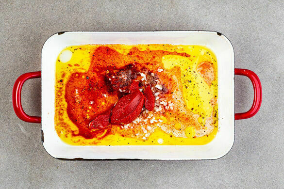 Das Paprikapulver, den Knoblauch und das Tomatenmark in einer großen Auflaufform mit 4EL Olivenöl, 4EL Essig, 1TL Salz, 1 kräftigen Prise Zucker sowie Pfeffer nach Geschmack verrühren. Tipp: Wer keine große Auflaufform hat, kann auch ein Backblech verwenden.