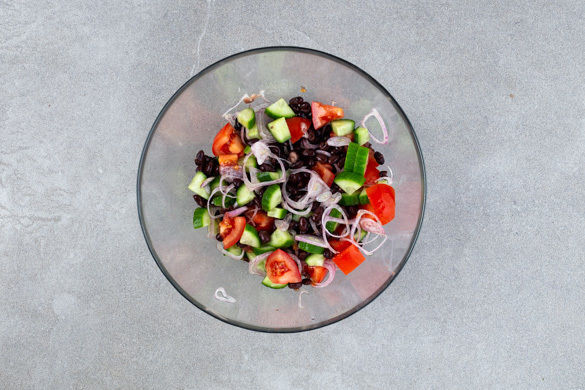Die Bohnen in ein Sieb abgießen, mit kaltem Wasser abspülen und abtropfen lassen. Die Schalotten schälen und in feine Ringe schneiden. Die Gurke in ca. 1cm große Würfel schneiden. Die Bohnen, die Schalotten, die Gurken und die restlichen Tomaten vermengen.