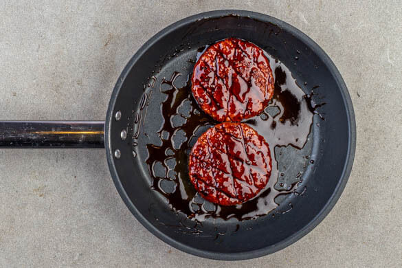 Die veganen Rindfleischpattys in einer mittelgroßen Pfanne mit 1EL Pflanzenöl bei mittlerer Hitze auf jeder Seite 3–5Min. braten, bis sie goldbraun und gar sind. Die Pfanne vom Herd nehmen, die Teriyakisauce und 1TL Essig einrühren und schwenken, bis die Pattys gleichmäßig von der Sauce überzogen sind.