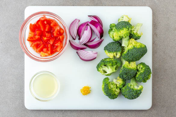 Inzwischen den Brokkoli in mundgerechte Röschen schneiden. Die Zwiebel schälen, halbieren und in 8 Spalten schneiden. Die Zitronenschale fein abreiben, dann die Zitrone halbieren und auspressen. Die Tomate grob würfeln, dann mit 1EL Essig und je 1 Prise Salz und Zucker mischen und beiseitestellen.