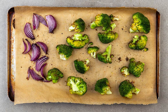 Den Brokkoli und die Zwiebeln auf ein mit Backpapier ausgelegtes Backblech geben, mit 1EL Olivenöl und je 1 Prise Salz und Pfeffer vermengen und 12–15Min. im Ofen backen, bis der Brokkoli und die Zwiebeln leichte Röstmarken bekommen.