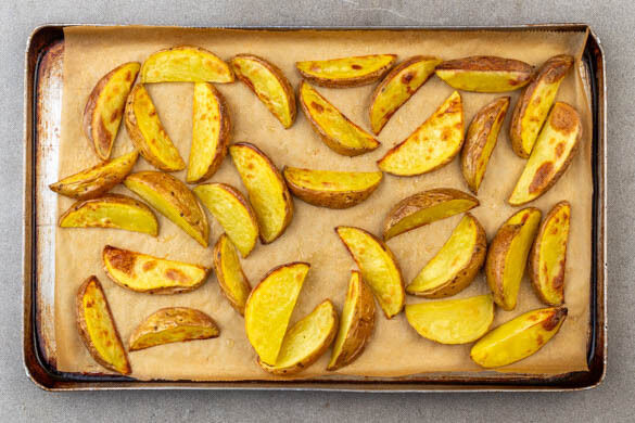 Den Backofen auf 240°C (220°C Umluft) vorheizen. Die Kartoffeln samt Schale in ca. 2cm breite Spalten schneiden und auf einem oder zwei mit Backpapier ausgelegten Backblechen mit 2EL Olivenöl und 1TL Salz vermengen. Die Kartoffeln in 20–24Min. im Ofen knusprig backen, dabei nach der Hälfte der Backzeit wenden.