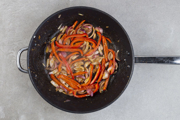 Die Paprika, die Zwiebeln und den Knoblauch in einer mittelgroßen Pfanne mit 1EL Olivenöl, 1TL Gewürzmischung und 1 Prise Salz bei mittlerer Hitze 2–3Min. anbraten, bis die Zwiebeln weich sind.