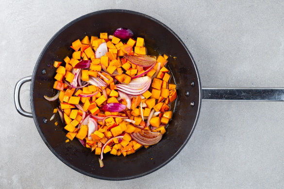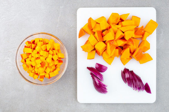 Den Kürbis halbieren und entkernen, eine Hälfte in 0,5–1cm kleine Würfel, die andere Hälfte in 2–3cm große Stücke schneiden. Die Zwiebel schälen, halbieren und in dünne Streifen schneiden.