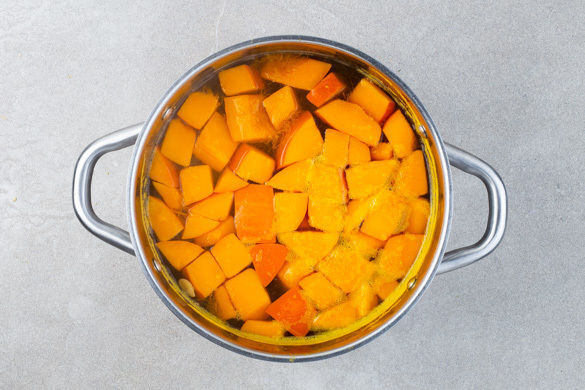 Die großen Kürbisstücke in einem mittelgroßen Topf mit ausreichend Salzwasser zum Kochen bringen und 10–15Min. köcheln lassen, bis der Kürbis weich ist.
