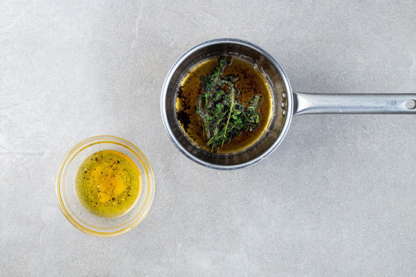 Für das Dressing 2EL Olivenöl, 2EL Essig und 2EL Wasser mit 1TL Honig und je 1 kräftigen Prise Salz und Pfeffer verrühren. Das Dressing kurz vor dem Servieren mit dem Feldsalat vermengen. In einem kleinen Topf 4EL Butter bei mittlerer Hitze schmelzen und braun werden lassen, dann den Zitronenthymian hineinlegen und den Topf vom Herd nehmen.