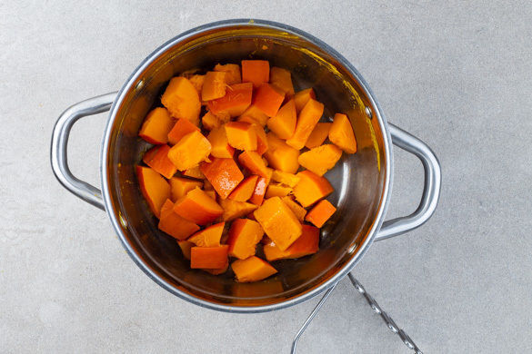 Die großen Kürbisstücke in einem großen Topf mit ausreichend Salzwasser zum Kochen bringen und 10–15Min. köcheln lassen, bis der Kürbis weich ist.