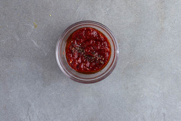 Das Tomatenmark mit dem restlichen Knoblauch, 2EL Olivenöl, 1TL Essig und 2EL Wasser zu einer Pizzasauce verrühren und mit Salz und Pfeffer abschmecken. Die Oliven grob schneiden.