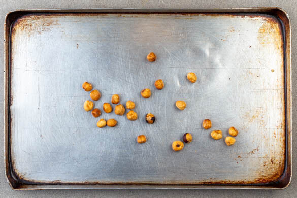 Die Haselnusskerne auf ein Backblech geben und im Ofen in 3–5Min. goldbraun anrösten. Inzwischen den Ahornsirup mit 2EL Olivenöl und 1 kräftigen Prise Salz zu einer Glasur verrühren. Die Nüsse aus dem Ofen nehmen und die Hitze auf 250°C mit Grillfunktion oder Ober-/Unterhitze einstellen.