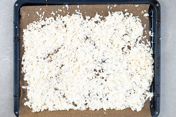 Den Blumenkohl mit einer Küchenreibe grob raspeln. Auf einem mit Backpapier ausgelegten Backblech mit 1–2EL Pflanzenöl sowie Salz und Pfeffer vermengen, gleichmäßig verteilen und ca. 8Min. im Ofen rösten, bis der Blumenkohlreis gar und an den Ecken leicht gebräunt ist.