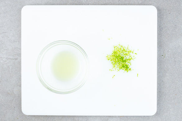 Den Backofen auf 220°C Umluft (240°C Ober-/Unterhitze) vorheizen. Die Limettenschale abreiben, dann die Limette halbieren und auspressen.