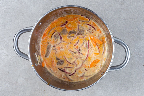 Das Fleisch aus dem Limettensaft nehmen und in einem großen Topf mit 1–2EL Pflanzenöl bei starker Hitze 2Min. scharf anbraten. 1EL Chilipaste unterrühren und mit 300–400ml Wasser und dem Limettensaft ablöschen. Das Brühgewürz und die Kokosmilch unterrühren und aufkochen lassen, dann die Zwiebeln, den Knoblauch und die Karotten zugeben und 5Min. sanft mitköcheln.