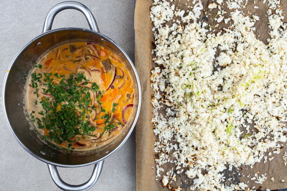 Das Curry nach Geschmack mit mehr Chilipaste sowie Salz würzen. Den Koriander samt Stängeln grob schneiden und unterrühren. Den Limettenabrieb nach Geschmack unter den Blumenkohl mischen. Das Curry mit dem Blumenkohlreis anrichten und servieren.