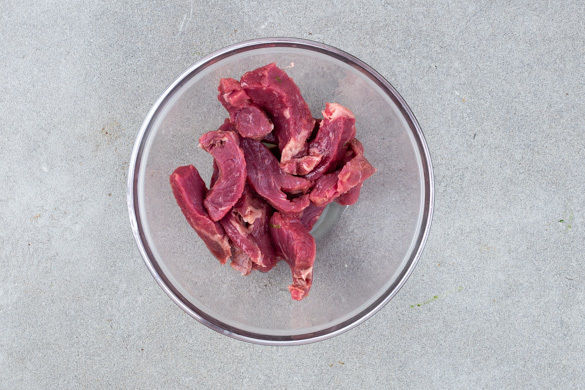 Das Fleisch mit etwas Küchenkrepp trocken tupfen und mit dem Limettensaft vermengen.