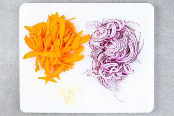 Die Zwiebeln schälen, halbieren und in feine Streifen schneiden. Den Knoblauch schälen und in hauchfeine Scheibchen schneiden. Die Karotten schälen, längs halbieren und schräg in möglichst dünne Scheiben schneiden.