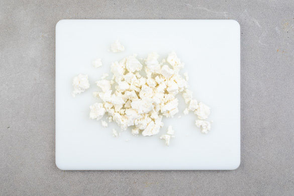 Den Feta mit etwas Küchenkrepp trocken tupfen und mit den Fingern oder einer Gabel zerkrümeln.