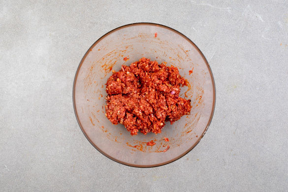 Das Hackfleisch mit den Zwiebelwürfeln, dem Knoblauch, dem Tomatenmark, 1EL Olivenöl, der Gewürzmischung und Salz nach Geschmack gut verkneten.