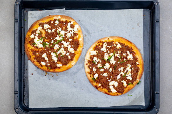 Die Hackfleischmasse gleichmäßig auf 4 Tortillas streichen und diese auf ein oder zwei mit Backpapier ausgelegte Backbleche geben. Den Feta auf dem Hackfleisch verteilen und die Lahmacun 5–7Min. im Ofen backen.