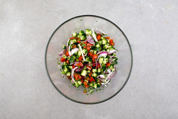 Die Gurke längs vierteln, die Kerne mit einem Löffel herauskratzen und die Gurke in kleine Würfel schneiden. Die Tomaten ebenfalls in kleine Würfel schneiden, dabei den Strunk entfernen. Die Petersilie samt Stängeln fein hacken. Die Gurken, die Tomaten, die Zwiebelstreifen und die Petersilie mischen und mit Salz und Pfeffer sowie 1EL Olivenöl und 1TL Essig würzen.