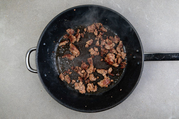 Das Hackfleisch in einer großen Pfanne bei starker Hitze 4–5Min. scharf anbraten, dabei je nach Pfanne ggf. 1–2TL Olivenöl verwenden. Das Fleisch auf einem Teller beiseitestellen, überschüssiges Fett in der Pfanne lassen.