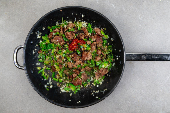 Die Paprika in derselben Pfanne im Bratfett bei starker Hitze 2–3Min. scharf anbraten. Die Zwiebeln und den Knoblauch zugeben und 1–2Min. mitbraten. Das Fleisch und die Kräuter untermischen und mit dem Sambal Oelek nach Geschmack sowie Salz und Pfeffer abschmecken.
