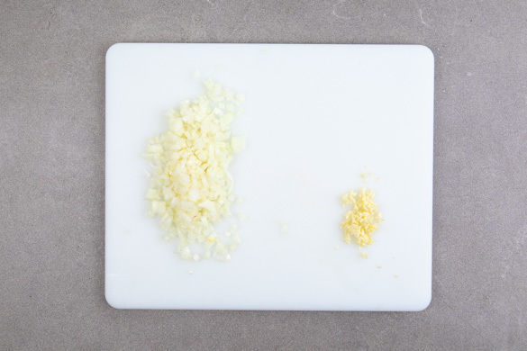 Die Zwiebel schälen, halbieren und in feine Würfel schneiden. Den Knoblauch schälen und ebenfalls fein würfeln.