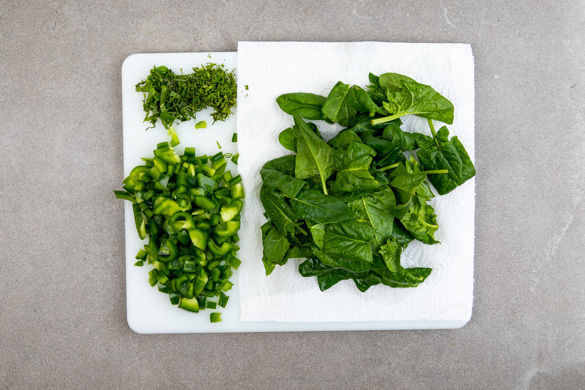 Die Paprika vierteln, entkernen und fein würfeln. Die Spinatblätter verlesen. Die Minzeblätter abzupfen und fein schneiden. Die Dillspitzen ebenfalls von den Stängeln zupfen und fein schneiden.