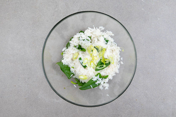 Die Lauchzwiebeln schräg in feine Ringe schneiden und mit dem Spinat unter den Reis heben, nach Wunsch mit Salz abschmecken. Die Kräuter-Lammhack-Pfanne auf dem Reis anrichten und servieren.