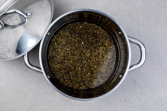 In einem großen Topf 2L Wasser zum Kochen bringen. ¾ der Linsen in einem Sieb mit kaltem Wasser abspülen, in das kochende Wasser geben und einmal aufkochen lassen. Dann abgedeckt bei mittlerer bis niedriger Hitze 18–20Min. sanft köcheln lassen, bis die Linsen bissfest sind.