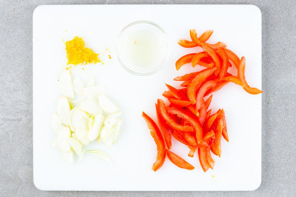Die Zwiebel schälen, halbieren und in feine Streifen schneiden. Die Zitronenschale abreiben, dann die Zitrone halbieren und auspressen. Die Tomaten vierteln, das Kerngehäuse entfernen und die Tomatenviertel in dünne Streifen schneiden.