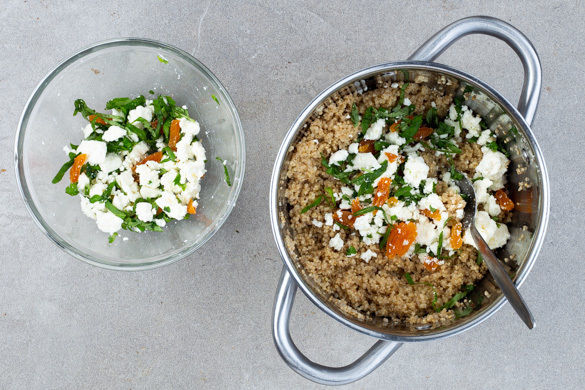 Den Feta zerbröseln. Die Basilikumblätter abzupfen und in feine Streifen schneiden. Die Aprikosen ggf. kleiner hacken und mit dem Feta und dem Basilikum vermengen. 2/3 der Fetamischung unter die Quinoa mengen und mit Salz und Pfeffer würzen. Die Salsicciapfanne auf der Quinoa anrichten, mit der restlichen Fetamischung garnieren und servieren.