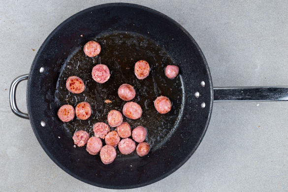 Die Salsiccia in ca. 1cm dünne Scheiben schneiden. Tipp: Wer mag, kann die Scheiben noch halbieren. Die Salsiccia in einer großen Pfanne mit 1EL Olivenöl bei mittlerer bis starker Hitze 2–3Min. anbraten. Auf einem Teller beiseitestellen, die Pfanne nicht auswischen.
