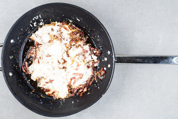 Die Crème fraîche, den Balsamicoessig und 1 Prise Zucker zum Speck in die Pfanne geben und gut verrühren, bis die Sauce cremig ist.