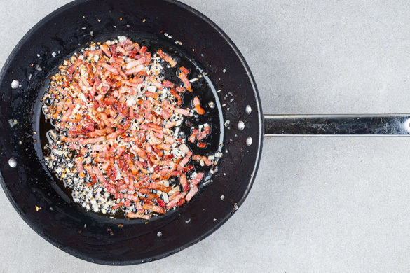 Den Speck und die Schalotten in einer großen Pfanne mit 1EL Olivenöl bei mittlerer Hitze 3–5Min. anbraten. 1–2EL Speck für die Garnitur auf Küchenkrepp abtropfen lassen. Den Knoblauch dazugeben und 1Min. mitbraten.
