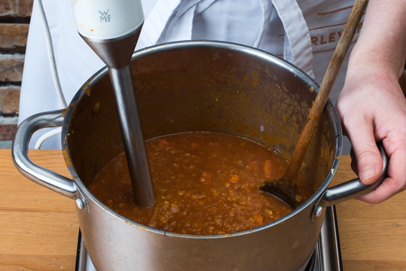 Das weich gegarte Karotten-Linsen-Gemüse mit einem Stabmixer pürieren und die Suppe mit dem restlichen Garam Masala sowie Salz und Pfeffer abschmecken.